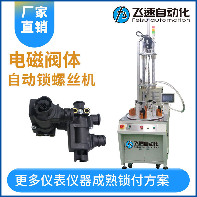 電池閥是用以電磁控制的工業設備,是用來控制流體的自動化基礎元件,目前電池閥有很多種,本案例主要講解電磁閥閥體的裝配技術,用于電磁閥閥體的壓鑄系統包括有一儲能器座和一閥體本體。 電磁閥閥體在生產中需要有精密的質量控制,在裝配中需要螺絲緊固,采用手工業作來尋找螺絲孔對準在鎖付,由于無法看清螺絲孔的內部,人工在作業時容易導致把產品擰壞或者滑牙等問題導致工作效率低生產標準品質低,為解決這些生產問題,廠家通常都會采用機器人或者電動螺絲刀來實現高度柔性自動化生產,飛速自動化在這里為廠家設計了一臺轉臺式多軸自動鎖螺絲機,該設備特點如下: 設備通過氣動元器件實現螺絲的自動輸送、擰緊、檢測等工序同步進行,通過設備來簡化螺絲緊固工序。可實現對多個工件進行四個面以上、任意角度的三維空間加工處理,使每條流水線一天工作八小時生產的產品可達到3200個以上,每條流水線可節約四名以上的工人,大大提升產能的同時,降低了工人的勞動強度;其采用柔性化設計,并適合對多個不同品種、不同型號的加工工件進行自動打螺絲,且換品種調試時間< I分鐘,節省時間,成本低,效率高,其又通過設置有翻轉機構可全自動智能化地對加工工件進行橫向或縱向翻轉,避免了人工對工件進行翻轉,并設置有定位機構和限位機構,對工件傳送進行定位和限位,加工定位精準,成品率高,效果好,智能化程度高,適合工業自動化發展的需求,結構簡單,使用簡單、快捷,便于廣泛推廣使用的多軸多工位獨立自動鎖螺絲機確屬必要。