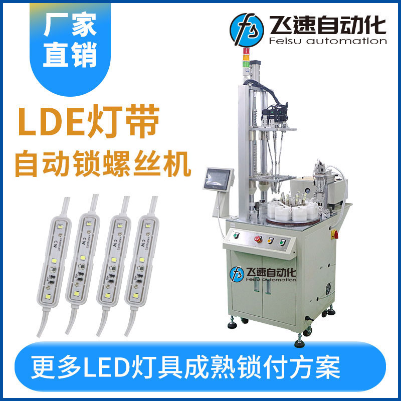 led燈帶是指把LED組裝在帶狀的柔性線路板或PCB硬板上,產(chǎn)品形狀象一條帶子又非常節(jié)能和綠色環(huán)保,用于各個(gè)行業(yè)中的裝飾,LED燈帶的使用也越來(lái)越普及,也因?yàn)槭褂脡勖L(zhǎng)(一般正常壽命在8~10萬(wàn)小時(shí)),所以在市場(chǎng)上需求也比較大。 LED燈帶是采用FPC做組裝線路板,生產(chǎn)組裝過(guò)程中都需要對(duì)燈具貼片和各個(gè)工件進(jìn)行螺絲緊鎖加工,在傳統(tǒng)的生產(chǎn)線上,技術(shù)工人需要對(duì)不同型號(hào)的燈具體分別進(jìn)行螺絲鎖緊加工操作,雖然也應(yīng)用了自動(dòng)機(jī)器人之類(lèi)的自動(dòng)設(shè)備,但是傳統(tǒng)生產(chǎn)線的自動(dòng)化水平還比較低,不能適用于不同型號(hào)的燈具加工,設(shè)備的自動(dòng)化水平還需提高。 本案例應(yīng)用于LED燈帶自動(dòng)化生產(chǎn)線的自動(dòng)鎖螺絲機(jī),主要目的在于解決生產(chǎn)中的不足和缺點(diǎn),設(shè)計(jì)一臺(tái)自動(dòng)化燈具生產(chǎn)螺絲設(shè)備,它不僅可以對(duì)燈具進(jìn)行自動(dòng)化地組裝、鎖緊加工操作,而且可以適用于不同型號(hào)、規(guī)格、大小的燈具體,設(shè)備的自動(dòng)化水平比較高。 該設(shè)備根據(jù)產(chǎn)品進(jìn)行設(shè)計(jì)多工位轉(zhuǎn)盤(pán)式螺絲機(jī),通過(guò)在轉(zhuǎn)盤(pán)式安放多個(gè)工位實(shí)現(xiàn)多工序同步作業(yè),主要是為了實(shí)現(xiàn)擰螺絲和取放產(chǎn)品同步完成,作業(yè)員不停放置產(chǎn)品,設(shè)備不停擰螺絲,增強(qiáng)了人機(jī)協(xié)作,較大幅度提升效率,減輕人工勞動(dòng)強(qiáng)度。