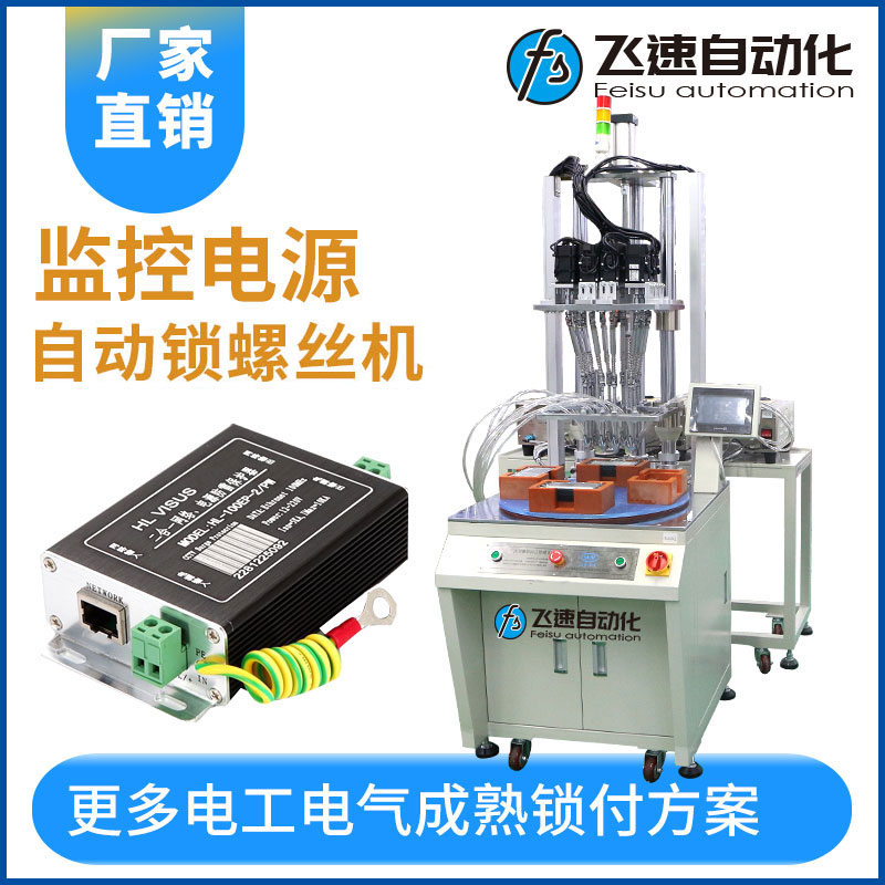 控制電源向電子設備提供功率的裝置,其電源功率的大小,電流和電壓是否穩定,將直接影響計算機的工作性能和使用壽命。 在組裝生產需要螺絲將產品進行緊固,但是在工人手操作效率低,效果差,勞務成本高。因此,針對傳統的加工處理流水線存在技術問題的不足 飛速自動化為解決上述問題為廠家設計了一臺多工位多軸式自動鎖螺絲機,工作臺上設立了多個工位多把電批同時運轉鎖付,通過送螺絲機構進行螺絲的輸送,上下運動裝置接觸螺絲,然后通過鎖螺絲機構對產品進行鎖螺絲作業,大大提高了工作效率,可以實現快速的鎖螺絲作業,特別適用于批量作業,同時通過電機的扭力控制,避免了螺絲欠品和浮鎖現象,保證產品質量,省時省力,節約生產工時,降低企業的生產成本。