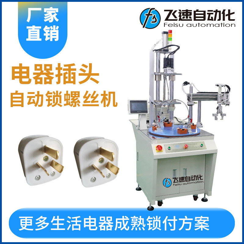 電源插頭作為一種日常用品,在生活中被廣泛使用。因此它的使用安全性也越來越引起人們的重視。現在常用的電源插頭由于為了便于插腳能順利的插入到插座的插孔中,一般是插座的插孔的內徑大于插腳的外徑并且插孔的絕緣上蓋上設置有倒角。但是這種結構也帶來了安全隱患。因為在插孔的絕緣上蓋處,插腳與插孔的內壁之間存在著一定的縫隙,在插頭的插拔過程中,很容易從縫隙中帶入雜質,引起短路,更危險的是,小孩有可能將手指伸入到縫隙中,有著觸電的危險,在生產中需要螺絲來緊固內部的螺絲,傳統手工放置螺絲和對準螺絲頭部仍需要占用大量的工作時間和精力,因此整體效率提升比較低,有而且很容易滑牙擰不緊等問題造成產品質量差,廠家會考慮到電動螺絲刀或者氣動螺絲刀擰緊兩種,后者通過電動或者氣動的方式產生旋轉動力,以代替頻繁手工的擰緊動作,雖然在生產上堅強了勞動的強度,但仍然存在生產效率得不到提升。 飛速自動化提供一臺機械手轉盤式自動擰螺絲機通過配置轉臺和機械手臂,由設備一次擰好多顆螺絲,擰好螺絲的產品由機械手臂抓起并放入流水線,設備可實現多軸擰螺絲、取放產品 、送螺 絲、員工放置工件等多工位同步圓周作業,生產效率極高。 機械手轉盤式擰螺絲機詳細介紹 省人工,流水線專用,配置機械手和轉盤,實現供料、檢測、鎖付、取放產品同步作業,并由設備自動完成,節省大量人工; 效率高,多把電批同時工作,可代替多名工人。電批數量可根據客戶要求定制; 易操作,傳統的手工取螺絲和對準螺絲孔需要占用大量的工作時間和精力,只需不停放置工件; 智能化,PLC智能電路控制.配置觸摸屏,操作簡單,員工只需放置工件即可; 高標準,鎖付工序完全由設備按程序自行完成,避免人工誤操作帶來的不良影響; 性能穩,關鍵部位采用高品質五金材料并經過特殊處理,電子原器件采用原裝進口。